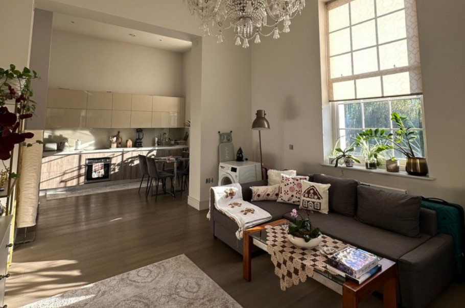 The open-plan living space is the heart of it all. Light moves across the wooden floors, catching the chandelier and giving the room a subtle warmth. It’s a space that works equally well for quiet evenings in as it does for hosting friends. The kitchen sits neatly along one side, modern and well-designed, offering everything you need without taking over the room.